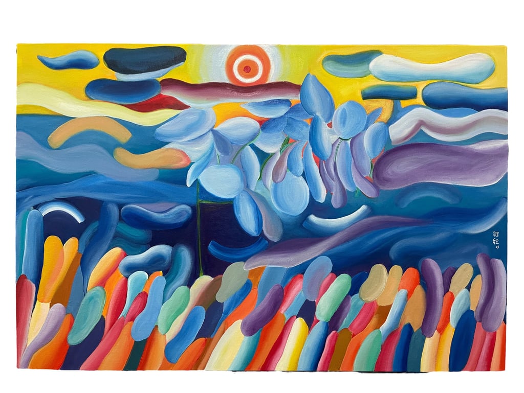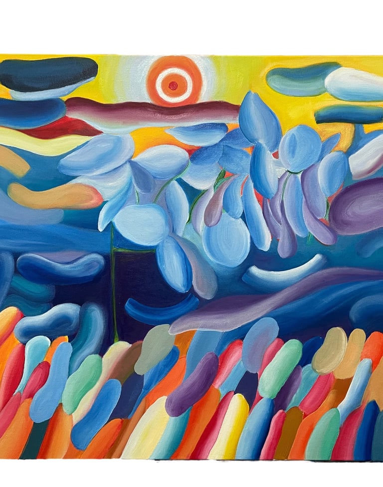 with deliberate brushstrokes and colours into a calm and abstract composition, drawing the viewer in. It is open, and allows open interpretation, while adding life and energy into the space.